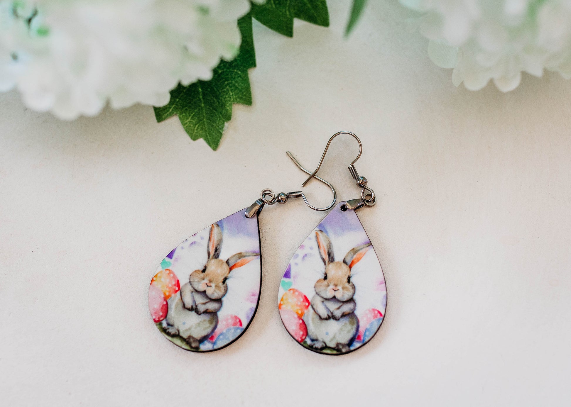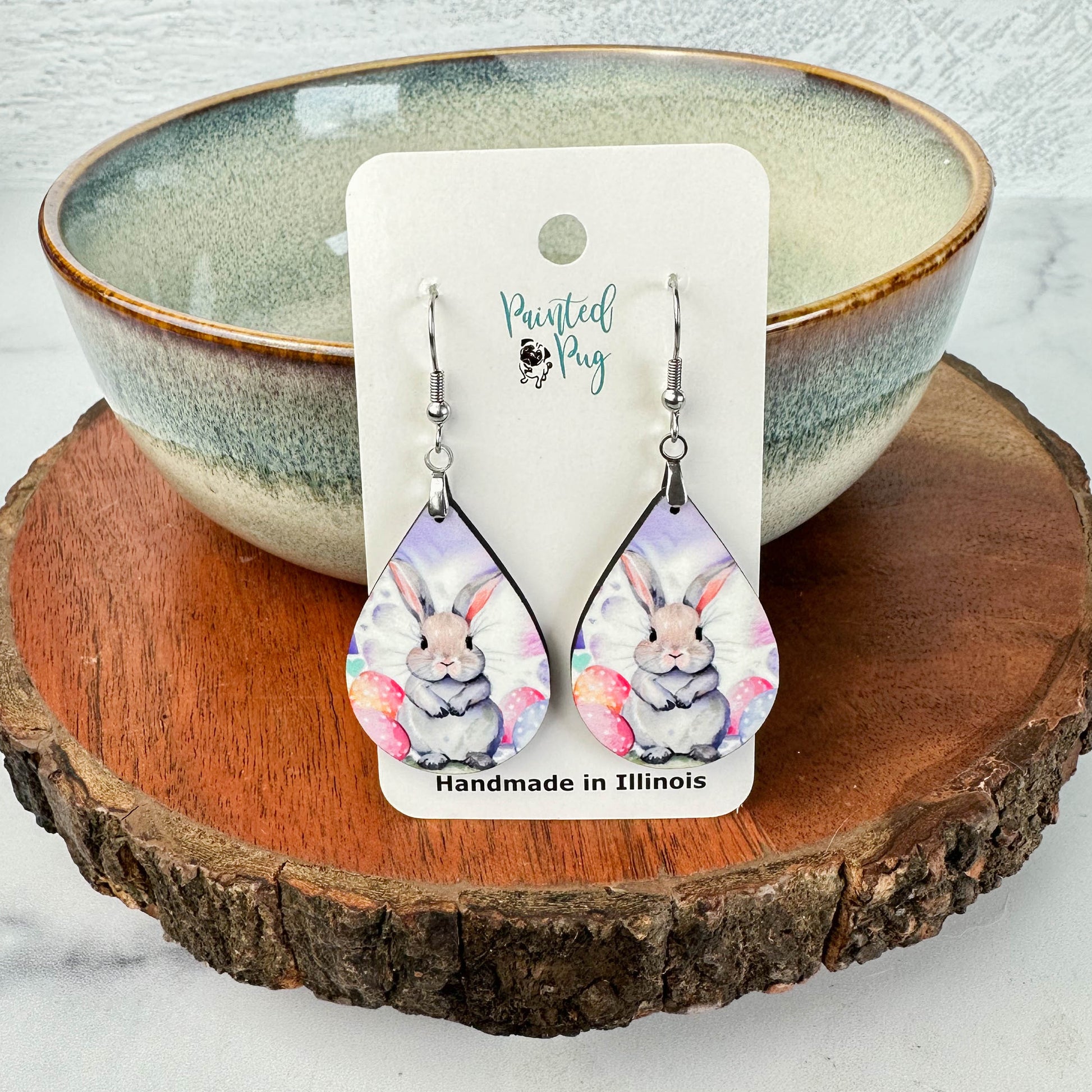 Easter Bunny Teardrop Earrings – Printed Wood Dangles in Two Sizes