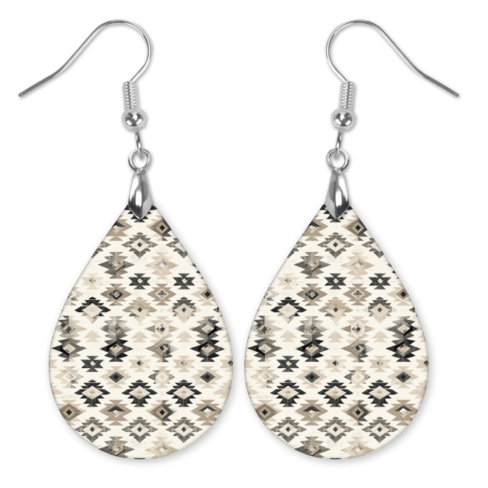 These black and beige Aztec teardrop earrings feature a classic geometric pattern with layered diamond shapes in neutral cream, taupe, and charcoal tones. The printed design offers a timeless southwestern-inspired look that’s easy to pair with casual outfits or elevated everyday styles. Made from lightweight material and finished with hypoallergenic stainless steel ear wires, these earrings are comfortable enough for all-day wear without sacrificing visual impact.
