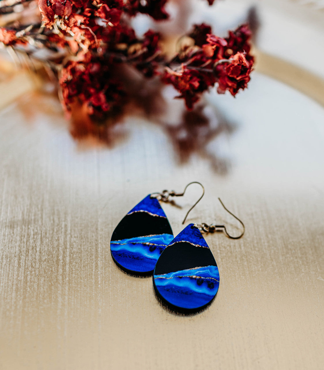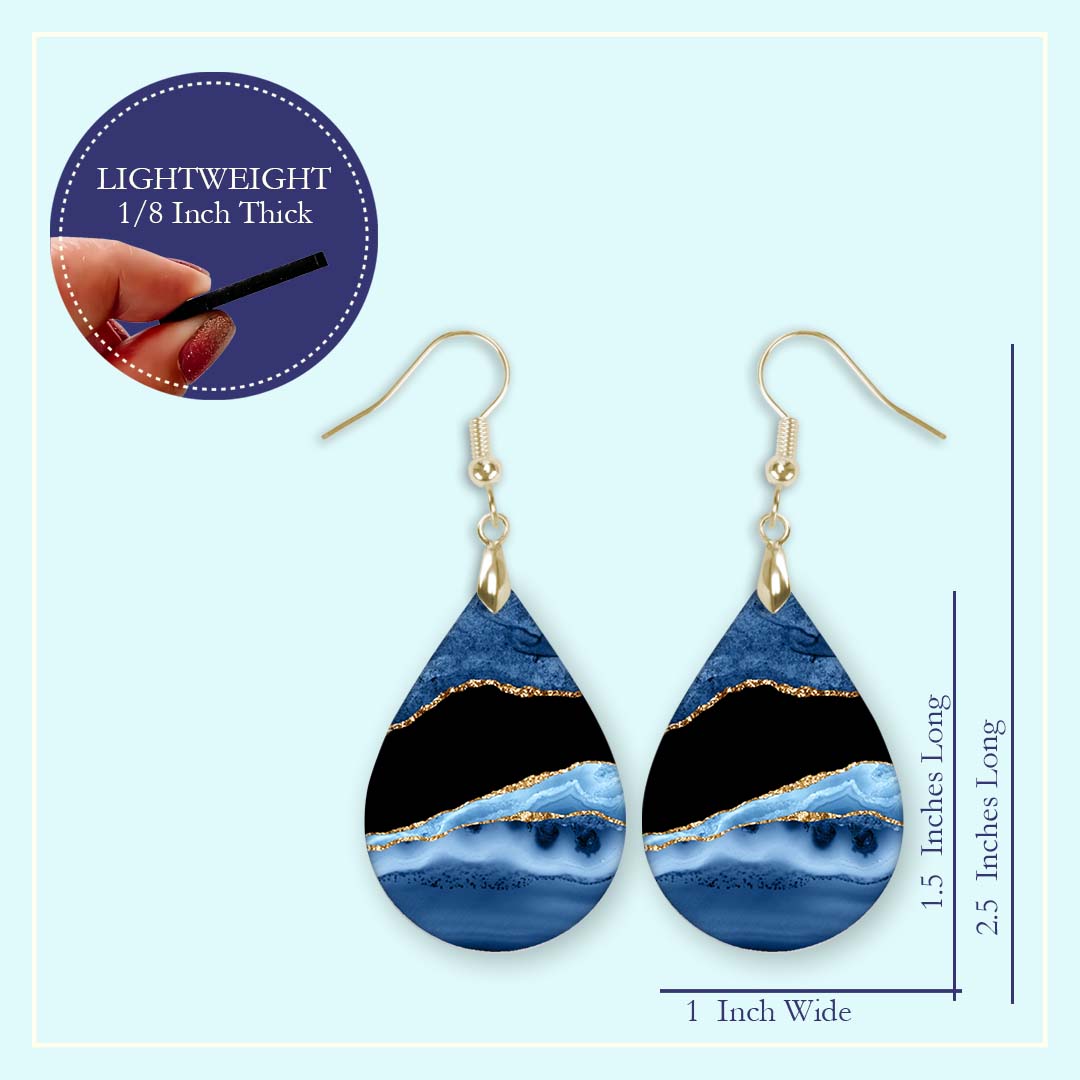 This is the pair that put us on the map. Our bestselling Blue Agate Teardrop Earrings feature a striking deep blue and black marbled pattern with fine gold accents, designed to look like polished stone with zero weight. Bold, beautiful, and ultra-lightweight, they became an instant customer favorite—and continue to be one of our most-loved designs.