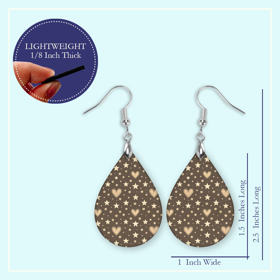 These brown heart and star teardrop earrings feature a warm neutral background with cream-colored hearts, stars, and dotted accents for a cozy, everyday look. The design is printed onto lightweight material, giving the appearance of soft texture without any added weight or dimension. This design does not contain real glitter or metallic elements—any visual texture is part of the printed artwork. Finished with hypoallergenic stainless steel ear wires, these earrings are easy to wear all day and pair well with casual or dressy outfits.