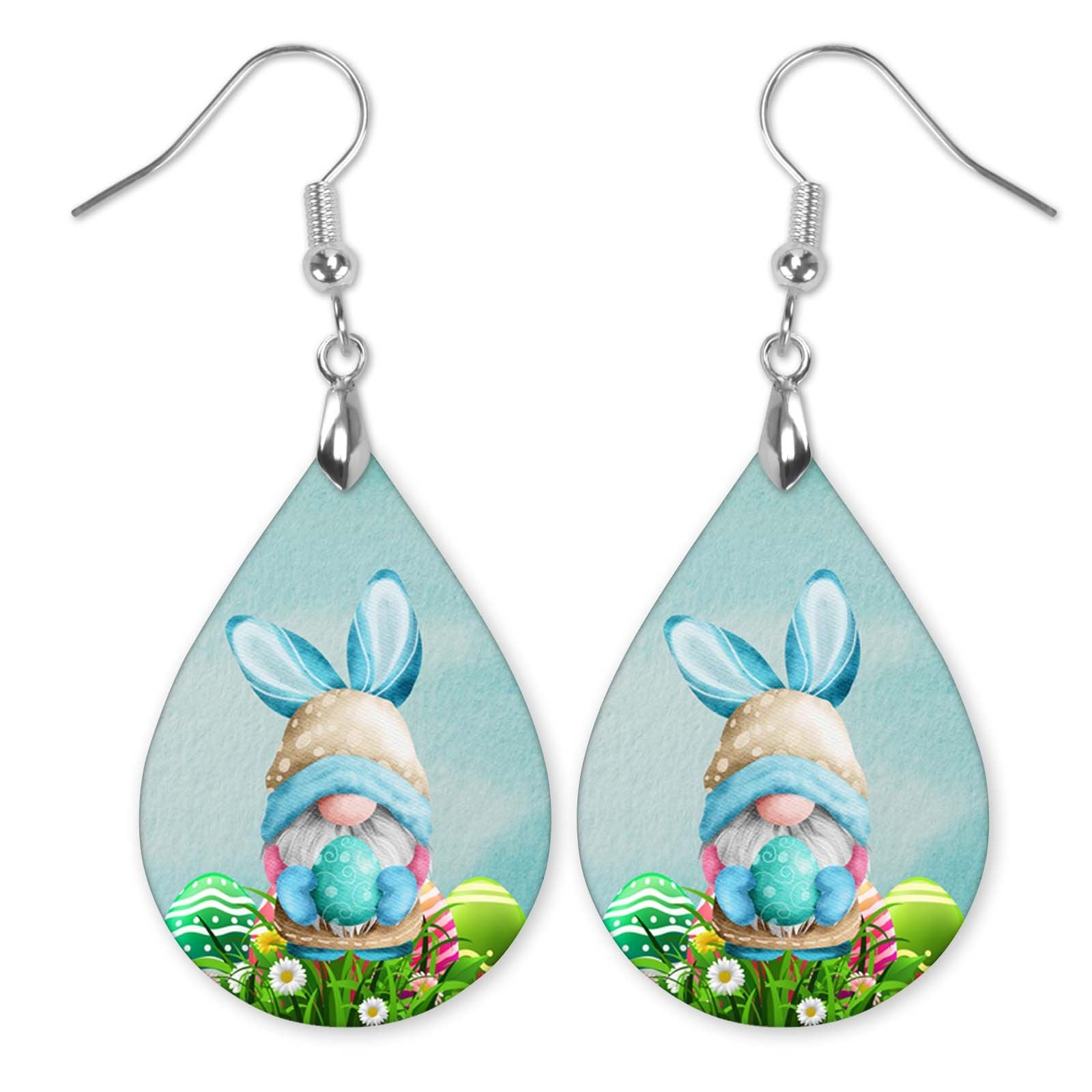 These Easter gnome teardrop earrings feature a sweet spring design with a teal-toned gnome holding a decorated Easter egg, surrounded by colorful eggs and fresh greenery. The playful artwork adds a festive seasonal touch while keeping the look soft and wearable. Made from lightweight material and finished with hypoallergenic stainless steel ear wires, these earrings are comfortable for all-day wear and perfect for Easter celebrations, spring outfits, or gifting.