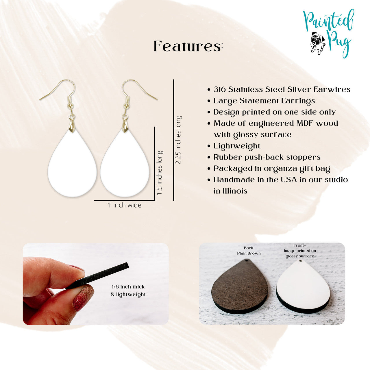 -The teardrops are 1.5" long, 1" wide and 1/8" thick. The earrings hang about 2.25" from the top of the earwires.