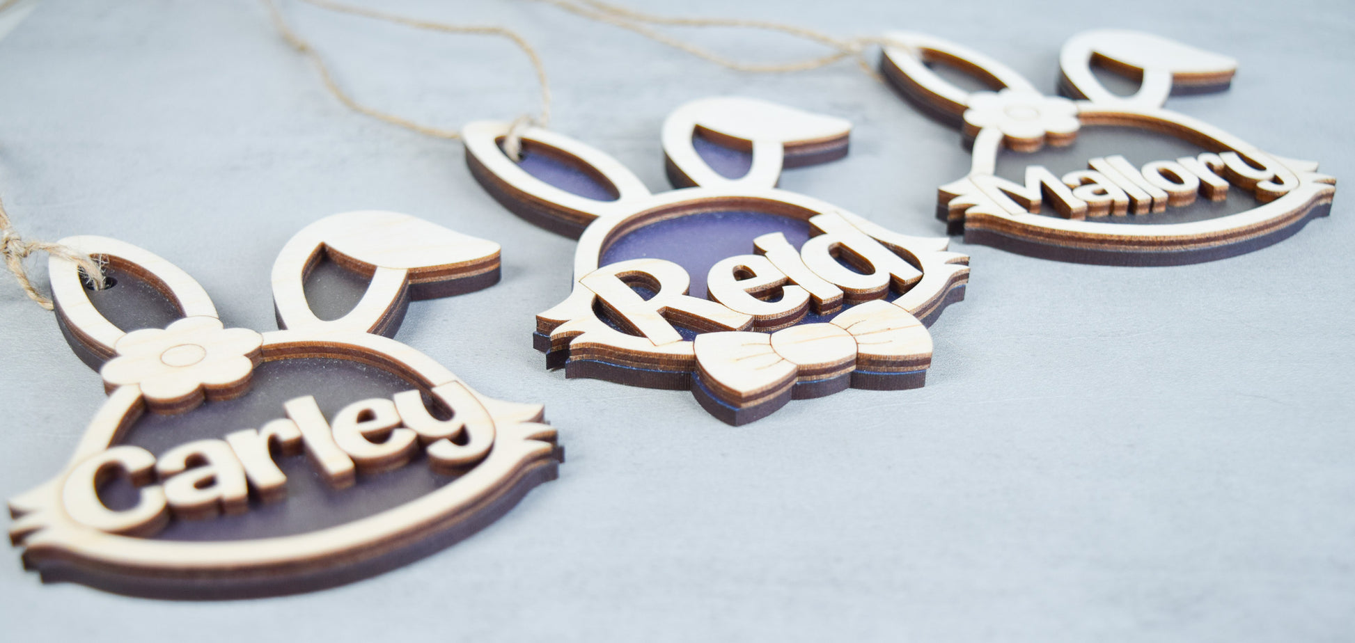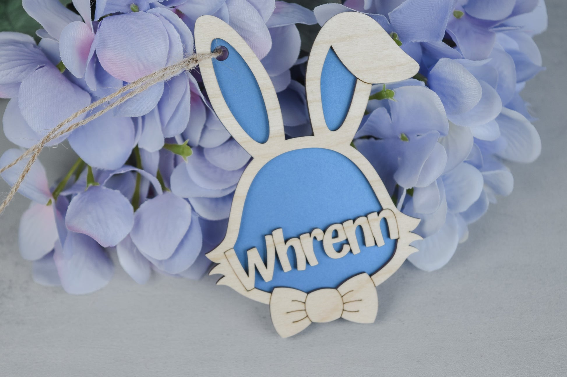 The tag features a laser-cut wood bunny with a vibrant acrylic background and raised wooden name for a dimensional look. Choose from blue, pink, or purple acrylic and customize the bunny with either a bowtie or a flower detail to match your child’s style. Finished with a rustic jute twine hanger, it easily ties onto baskets or gifts.