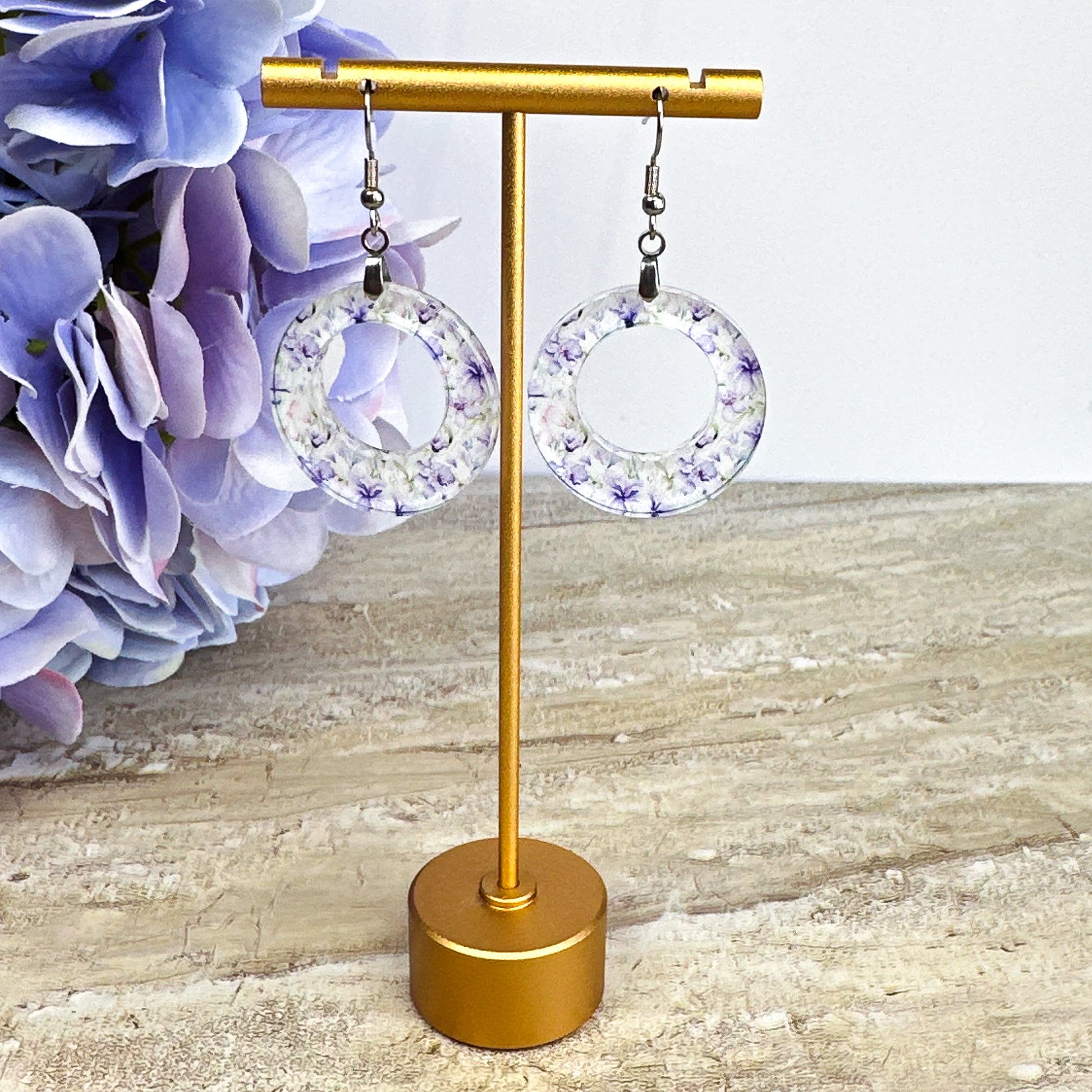 Purple Floral Hoop Dangle Earrings – Lightweight Acrylic Circle Earrings