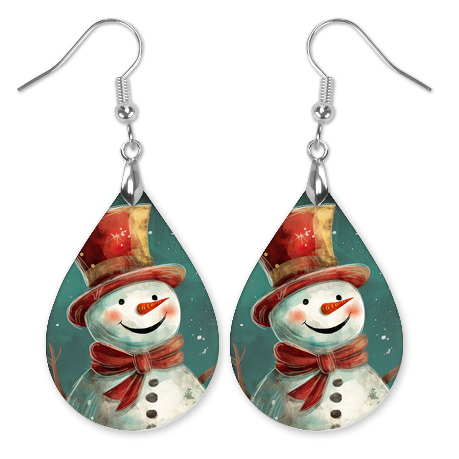 Add a touch of winter cheer with these snowman teardrop earrings. Featuring a jolly snowman in a red scarf and top hat against a snowy teal background, they bring classic holiday charm to any outfit. Each pair is printed on both sides of lightweight MDF wood with stainless-steel earwires for comfortable wear all season long.
