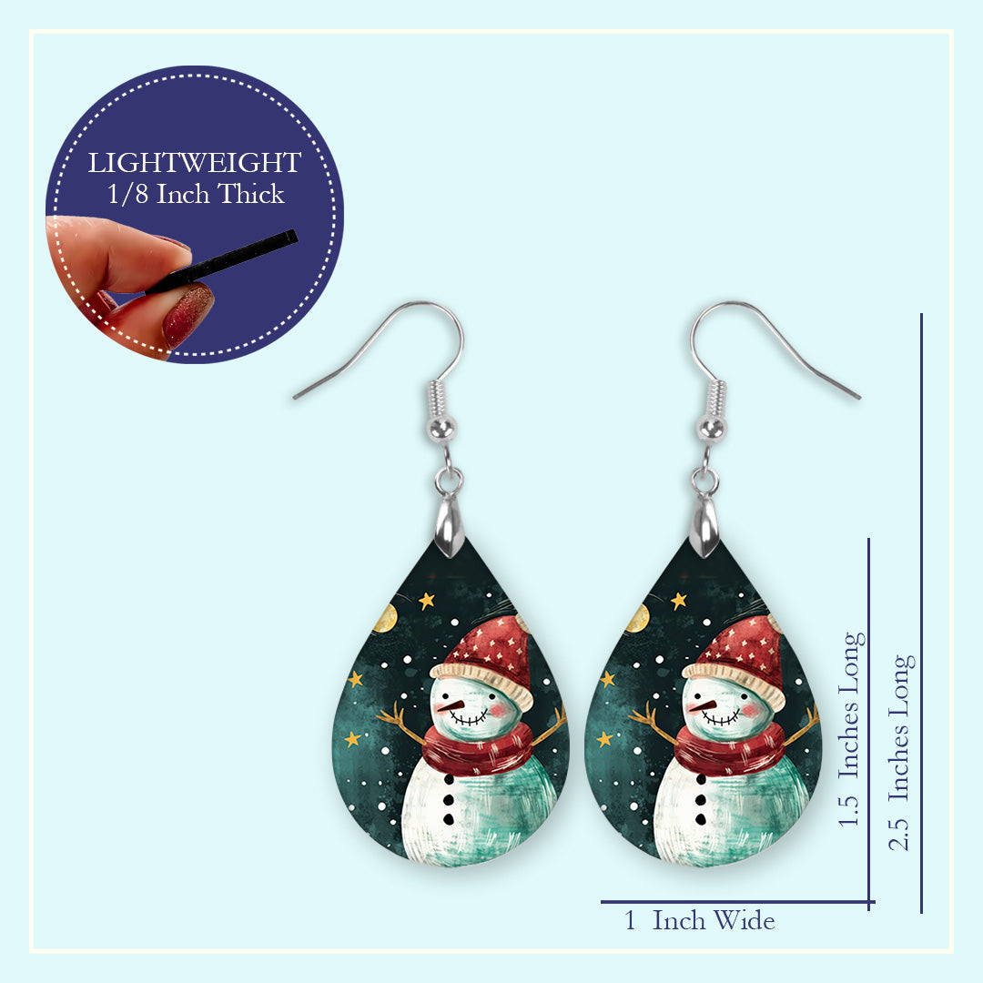 Add a touch of winter cheer with these snowman teardrop earrings. Featuring a jolly snowman in a red scarf and hat against a snowy teal background, they bring classic holiday charm to any outfit. Each pair is printed on both sides of lightweight MDF wood with stainless-steel earwires for comfortable wear all season long.