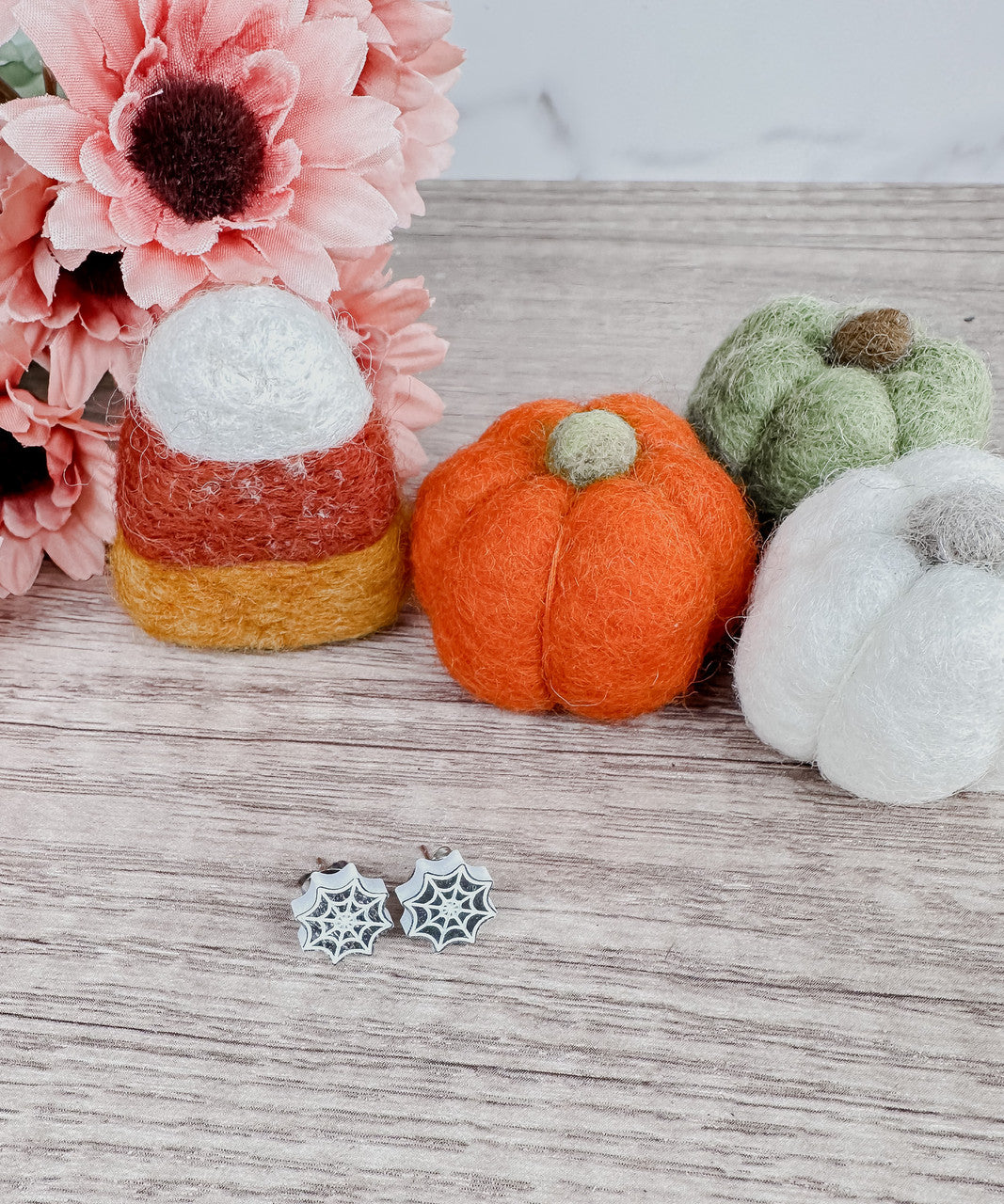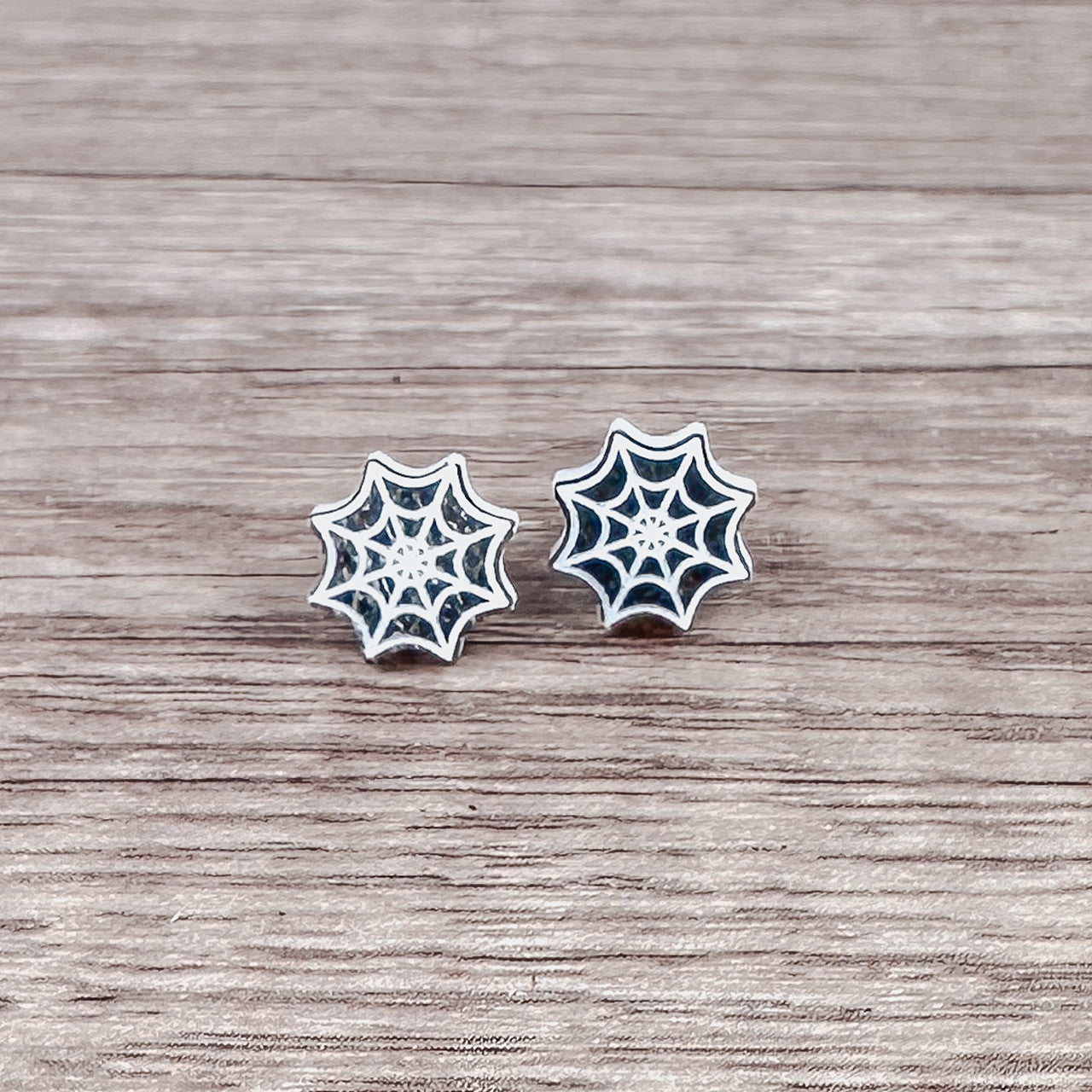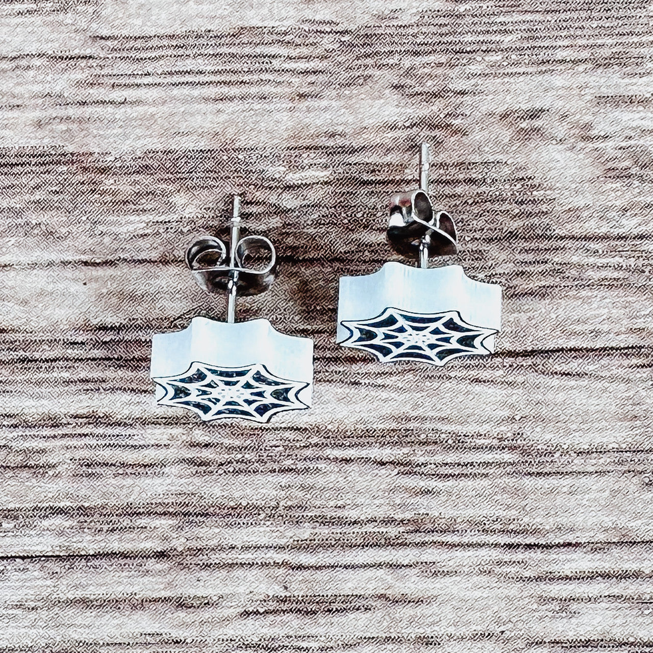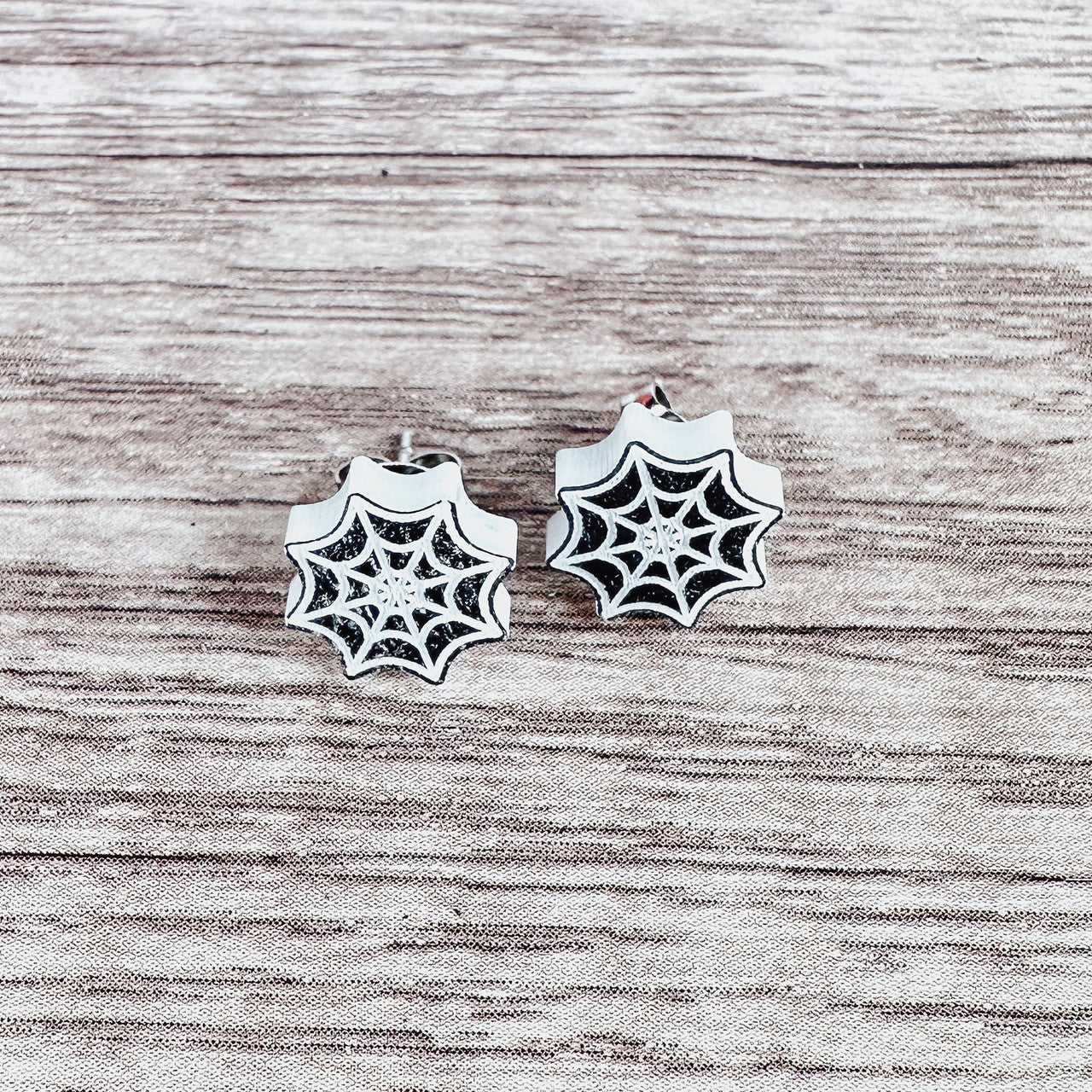 - These adorable spider web stud earrings are engraved into black and white acrylic.