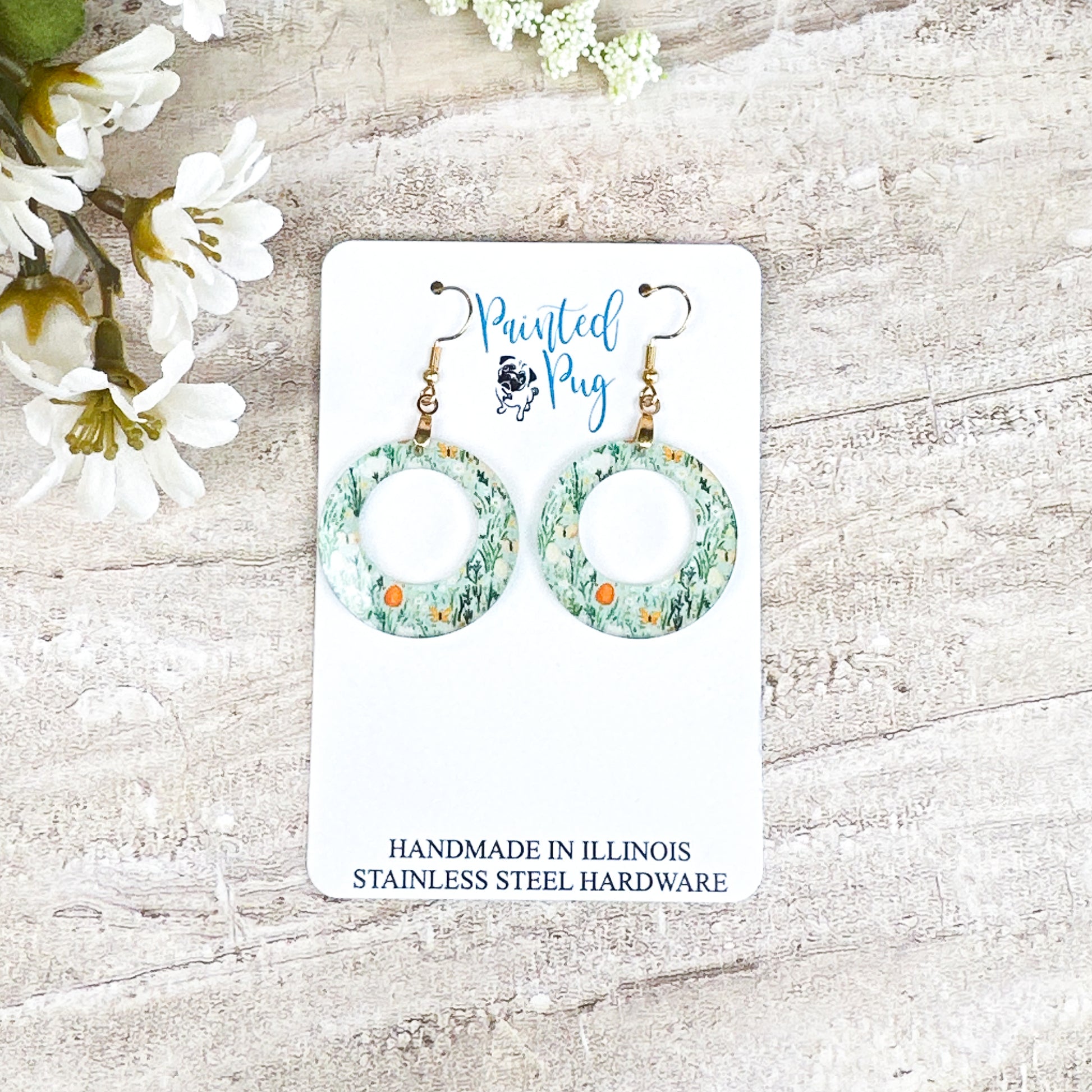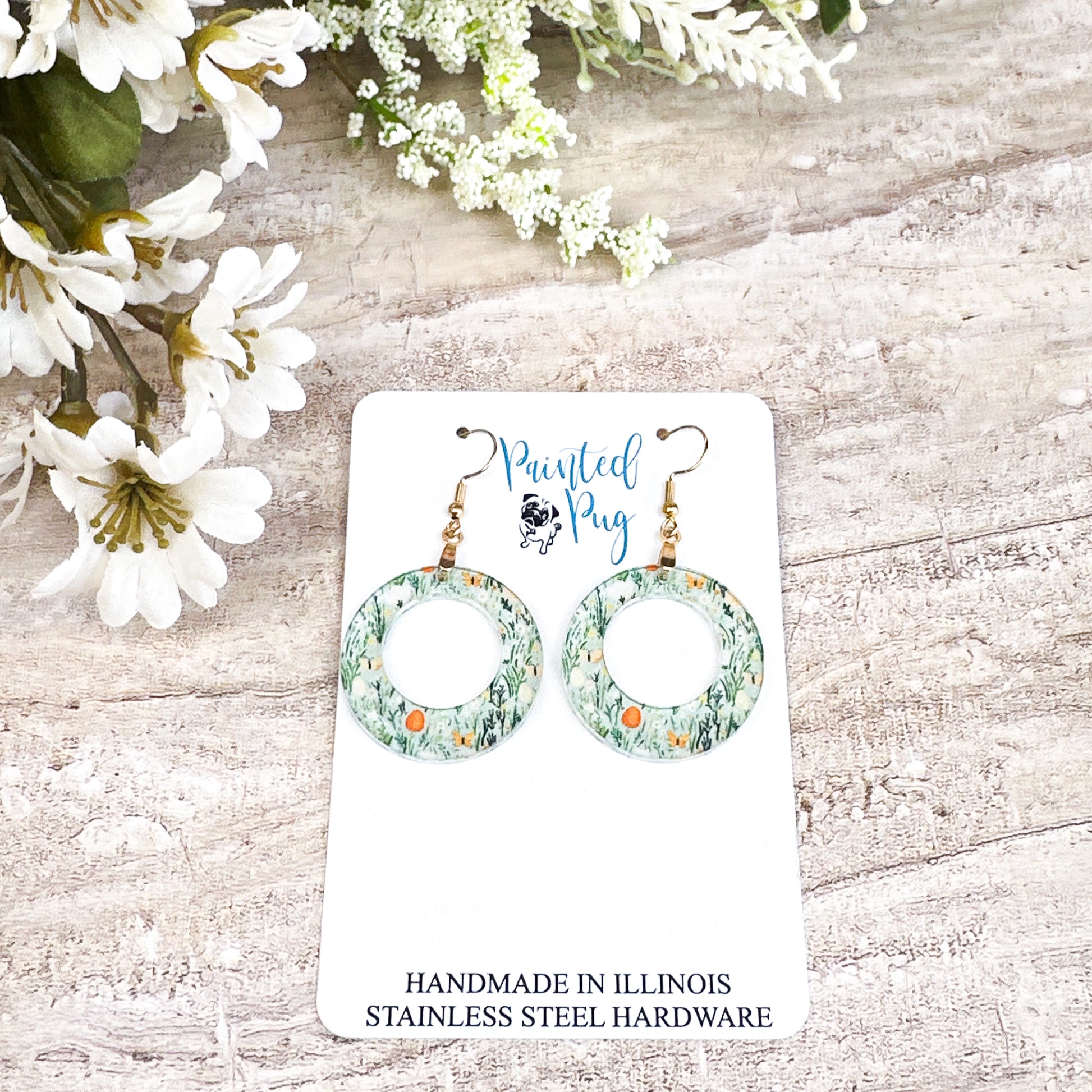 Spring Meadow Hoop Dangle Earrings – Green Floral Acrylic Circle Earrings