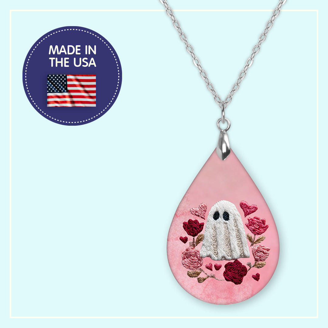 These Valentine ghost teardrop earrings feature an adorable ghost surrounded by pink roses and heart accents on a soft blush background. The playful yet romantic design makes them perfect for Valentine’s Day outfits, Galentine’s celebrations, or adding a little spooky-cute charm to everyday wear.